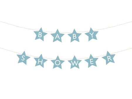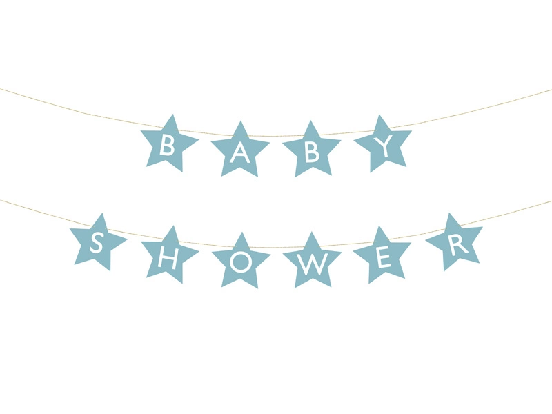 - Baner w kształcie gwiazdek z napisem Baby Shower wykonany z papieru w kolorze jasnoniebieskim, wymiary sznurka ok. 3m.