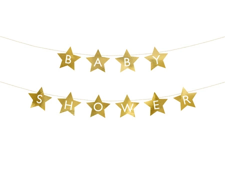 - Baner w kształcie gwiazdek z napisem Baby Shower wykonany z papieru w kolorze złotym, wymiary sznurka ok. 3m.