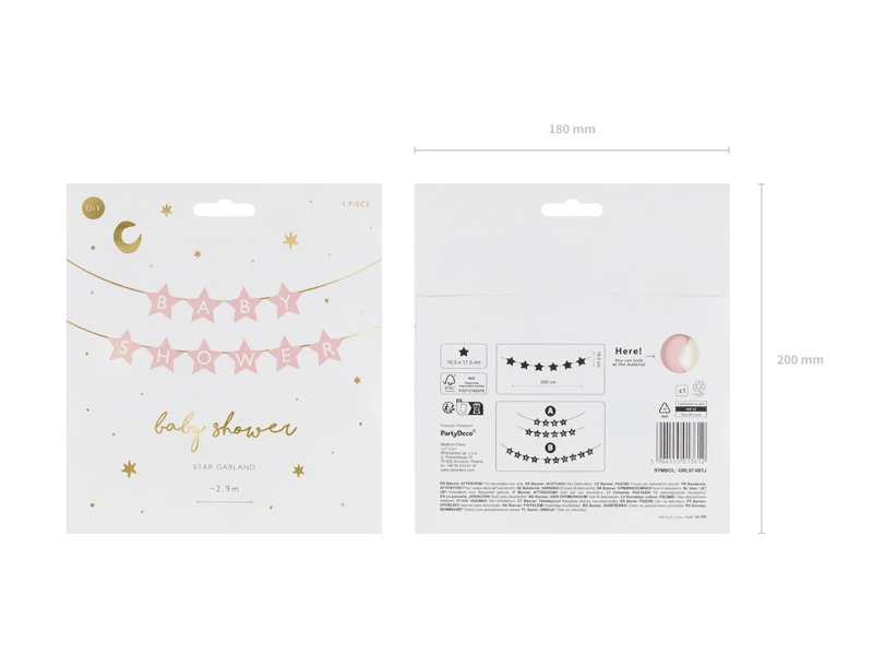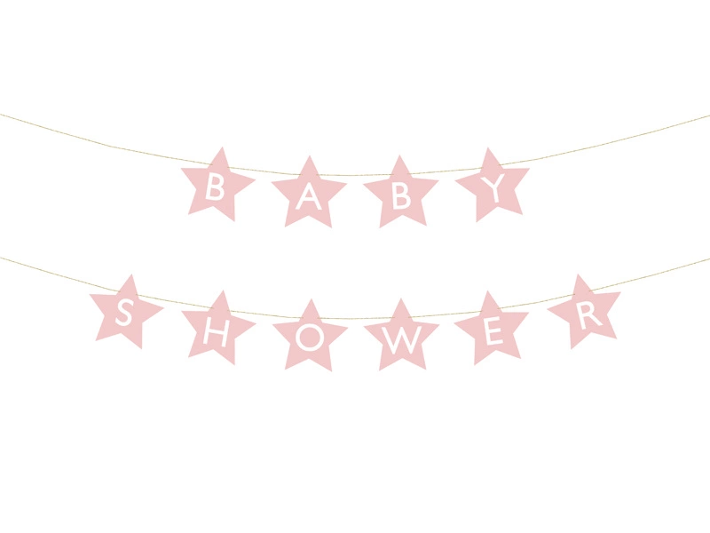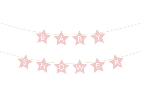 - Baner w kształcie gwiazdek z napisem Baby Shower wykonany z papieru w kolorze jasnoróżowym, wymiary sznurka ok. 3m.
