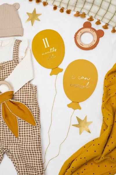 - Karty do zdjęć Baloniki, mix kolorów, zestaw zawiera 12 kart w kształcie baloników z metalizowanym nadrukiem oraz 300 cm złotego sznurka, wymiar jednej karty ok. 11.5 x 17 cm.