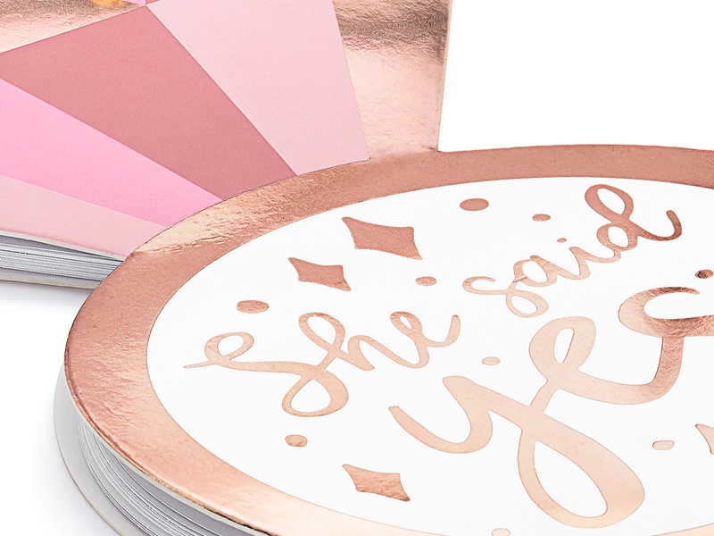 - Księga gości Pierścionek wykonana z papieru, mix kolorów z napisem ''She said yes'' w kolorze różowego złota, zawiera 22 strony do wypisania, wymiary ok. 17 x 27 cm.