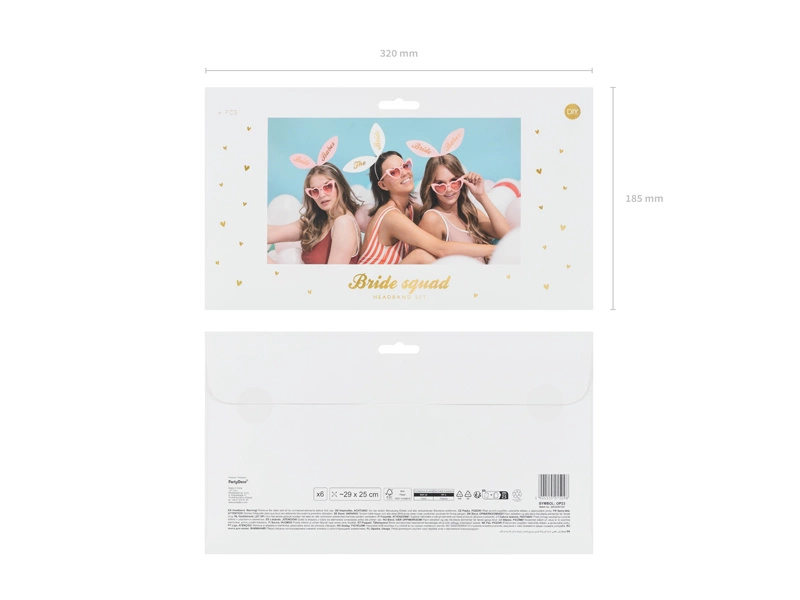 - Zestaw 6 opasek z uszkami Bride Squad, 5 opasek w kolorze różowym z napisem "Bride Babes" i 1 w kolorze biały z napisem "The Bride". Wymiary ok. 29x25 cm. (1 op. / 6 szt.)