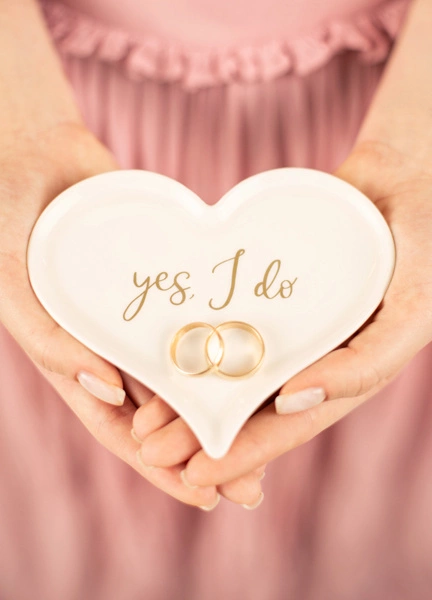 - Talerzyk porcelanowy na obrączki w kształcie serca w kolorze białym z napisem "yes, I do" w kolorze złotym, wymiary ok. 133 x 10.8 cm.