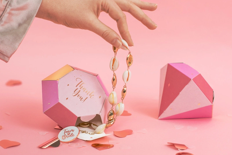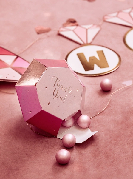 Wprowadź nutę elegancji i blasku na swoją imprezę dzięki naszym wyjątkowym Pudełkom Diamenty! Te stylowe pudełka w kształcie diamentów są doskonałym wyborem na każdą okazję - od wesel, przez wieczory panieńskie, aż po urodziny i baby shower. W zestawie znajdziesz 6 sztuk w różnych kolorach, które z pewnością oczarują Twoich gości.
