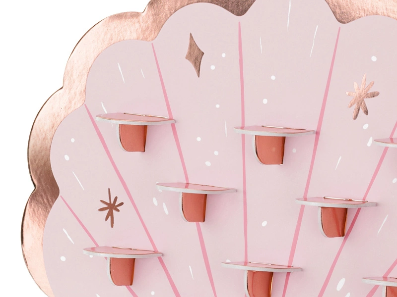 - Ściana na shoty Muszelka, wykonana z papieru z 10 podstawkami do samodzielnego zamontowania, szerokość ok. 43 cm wysokość ok. 38 cm.