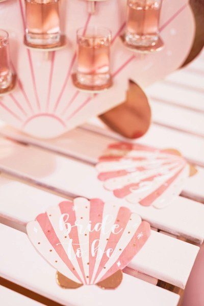 - Serwetki papierowe Muszelka w kolorze różowym ze złotym napisem Bride to be, wymiary po rozłożeniu ok. 27.5 x 26 cm, wymiary po złożeniu ok. 13.5 x 13 cm. (1 op. / 20 szt.)