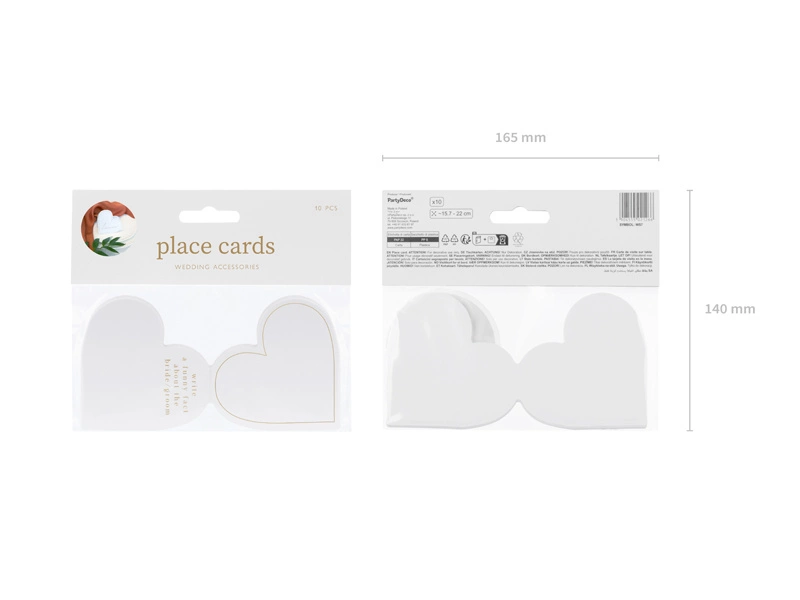 Wprowadź odrobinę wyrafinowania i niepowtarzalnego stylu na swoje przyjęcie z naszymi białymi wizytówkami na stół w kształcie serca, ozdobionymi subtelnym złotym nadrukiem. Te eleganckie wizytówki są doskonałym wyborem na wesela, wieczory panieńskie, urodziny, baby shower i inne wyjątkowe okazje. Każda wizytówka ma wymiary 15.7 x 22 cm, a w opakowaniu znajduje się 10 sztuk.