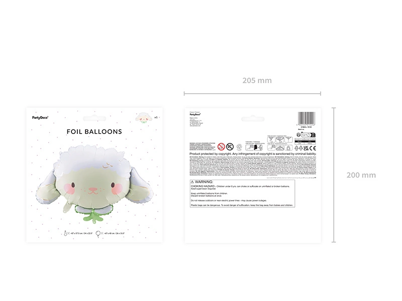 - Balon foliowy Owieczka, mix kolorów, wymiary przed napompowaniem ok. 87 x 57.5 cm (34 x 22.5 ''), wymiary po napompowaniu ok. 67 x 40 cm (26 x 15.5 ''). Do napompowania powietrzem i helem. Zestaw zawiera słomkę.