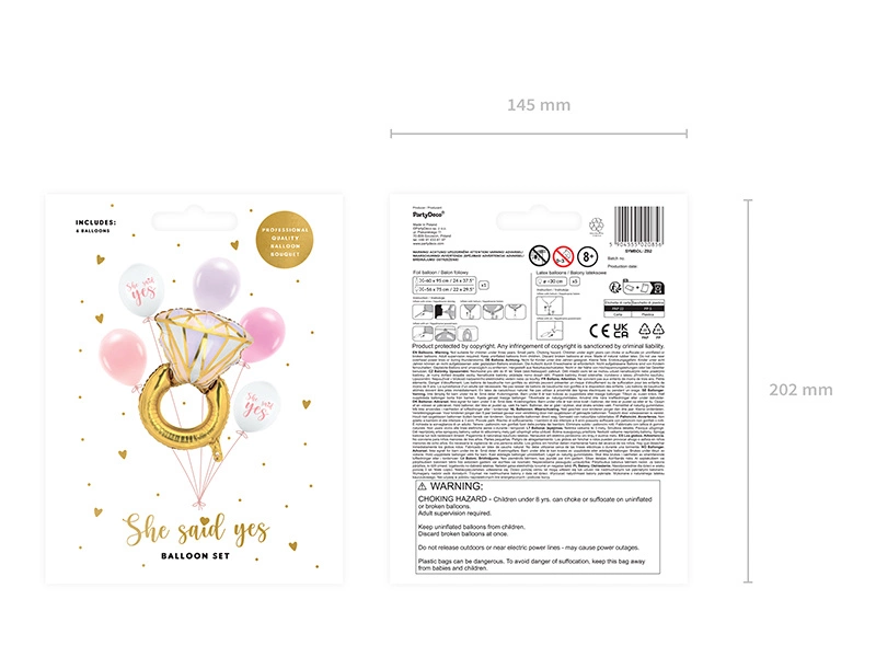 - Zestaw balonów Pierścionek, zestaw zawiera 6 balonów (balony Strong: 1 w kolorze Pastel Pale Pink, 1 w kolorze Pastel Baby Pink, 1 w kolorze Pastel Light Lilac, 2 w kolorze Pastel White z różowym nadrukiem, 1 balon foliowy w kształcie Pierścionka). Średni
