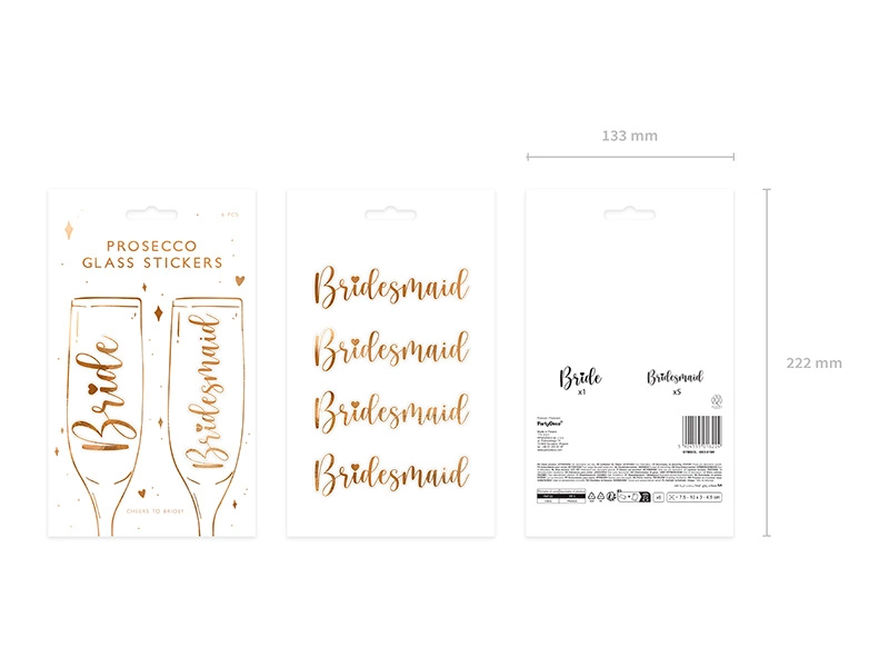 - Naklejki na kieliszki ''Bride & Bridesmaid'' w kolorze różowego złota, zestaw zawiera 6 naklejek na blistrach, wymiary ok. 7.5-10 x 3-4.5 cm. (1 op. / 6 szt.)