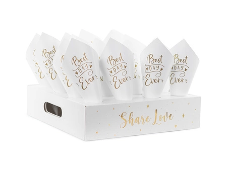 Chcesz dodać swojej imprezie odrobinę magii i elegancji? Nasz stojak na rożki do konfetti jest idealnym rozwiązaniem! W zestawie znajdziesz 16 papierowych rożków na konfetti ze złotym napisem oraz stand do samodzielnego złożenia. To doskonały wybór na wesela, wieczory panieńskie, urodziny i inne wyjątkowe okazje.