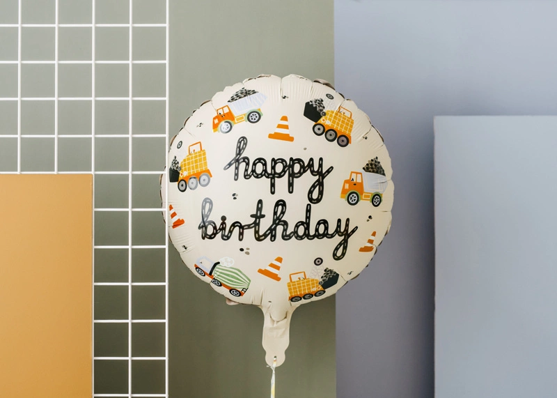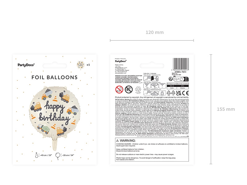 - Balon foliowy okrągły Pojazdy budowlane, mix kolorów, wymiary przed napompowaniem ok. 45 cm (18''), wymiary po napompowaniu ok. 35 cm (14''). Do napompowania powietrzem i helem. Zestaw zawiera słomkę.