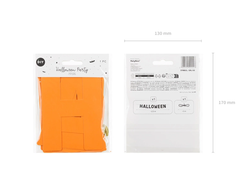 - Baner napis Halloween wykonany z papieru w kolorze pomarańczowym. Wysokość ok. 14 cm, długość sznurka ok. 3 m. Produkt do samodzielnego złożenia.