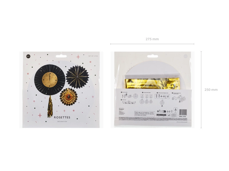 - Rozety dekoracyjne Zegar wykonane z papieru z frędzlem, mix kolorów, średnice po złożeniu ok, 26 cm, 35 cm, 43 cm. (1 op. / 3 szt.)