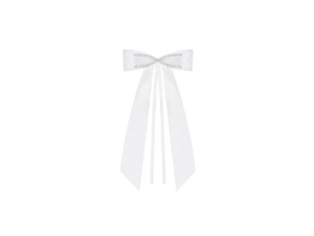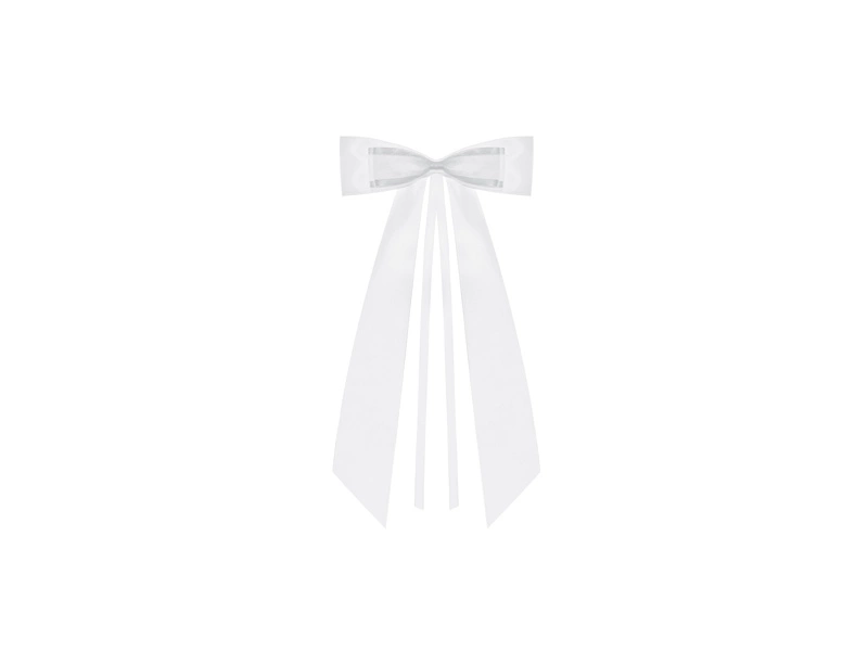 - Kokardy z tasiemki satynowej w kolorze białym, z szyfonową muszką, rozmiar około 14 centymetrów. (1 op. / 4 szt.)