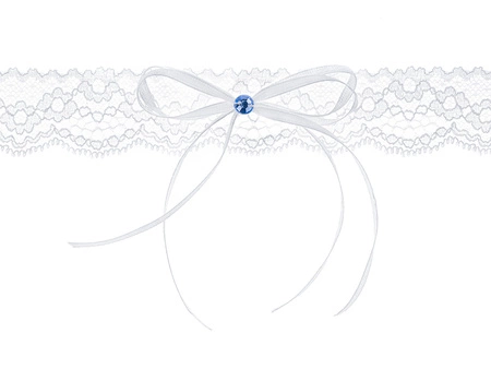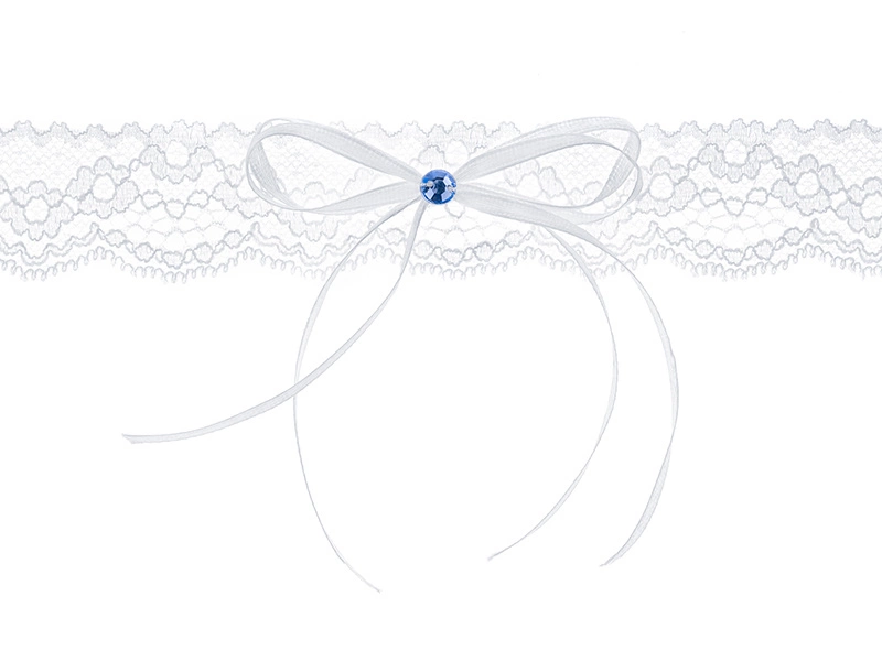 - Podwiązka koronkowa w kolorze białym z satynową tasiemką i niebieskim oczkiem, szerokość 3,5 centymetra.