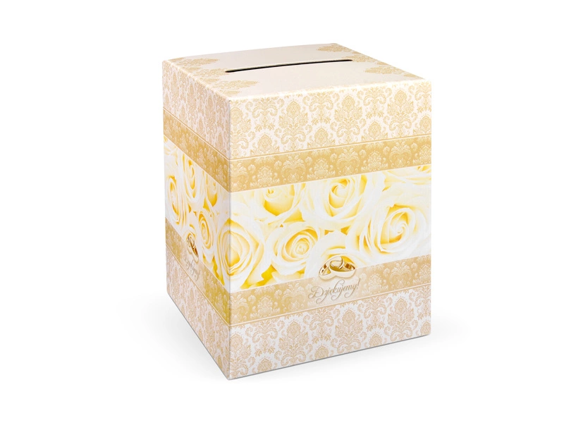 - Pudełko na telegramy z papieru ze złotym nadrukiem, z napisem Dziękujemy!, wymiary pudełka po złożeniu 25x25x30 centymetrów.