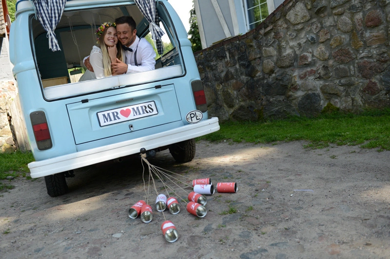 - Zamocuj puszki na tylnym zderzaku samochodu ślubnego, aby uzyskać klasyczny efekt.