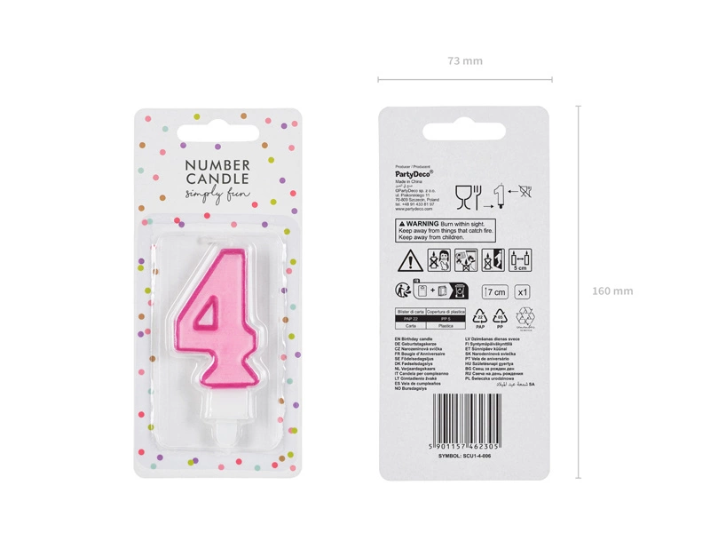 - Świeczka urodzinowa Cyferka 4 w kolorze różowym, rozmiar 7 centymetrów.