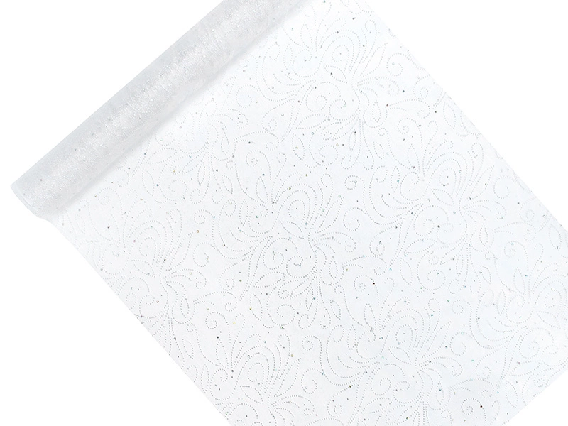 - Organza w kolorze białym z perłowym, jednostronnym nadrukiem, wymiary 0,48x9 metrów.