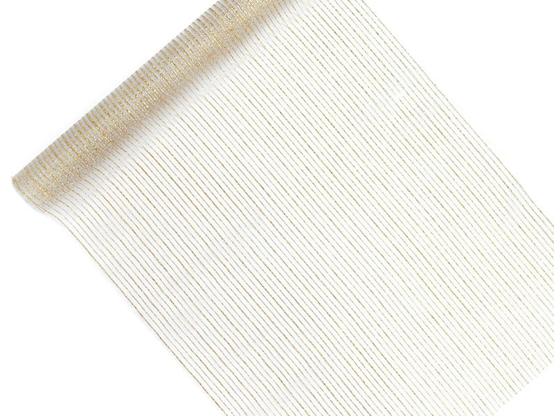- Organza w kolorze białym ze złotym, brokatowym, jednostronnym nadrukiem, wymiary 0,48x9 metrów.