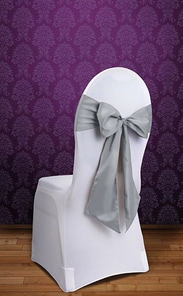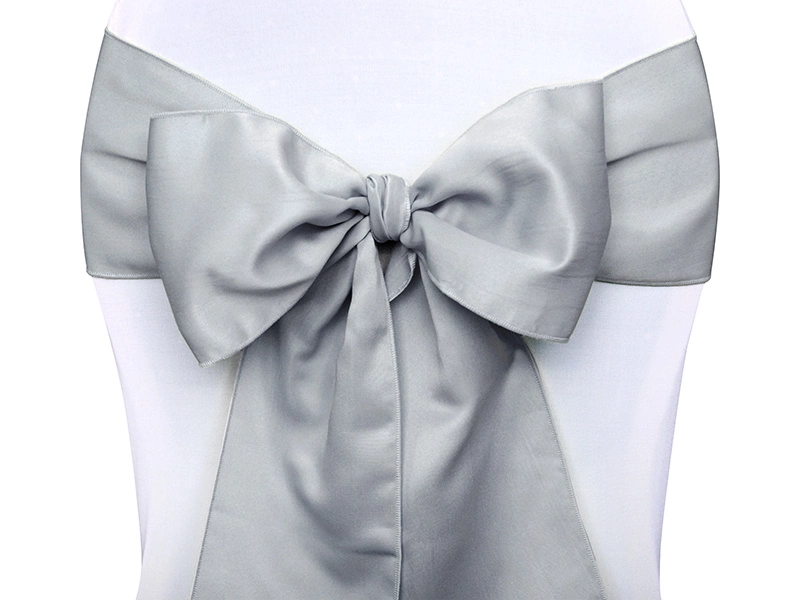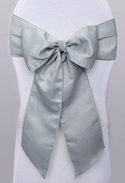 - Szarfy na krzesło z grubej matowej satyny w kolorze srebrnym, długość 2,75 metra, szerokość 15 centymetrów. (1 op. / 10 szt.)