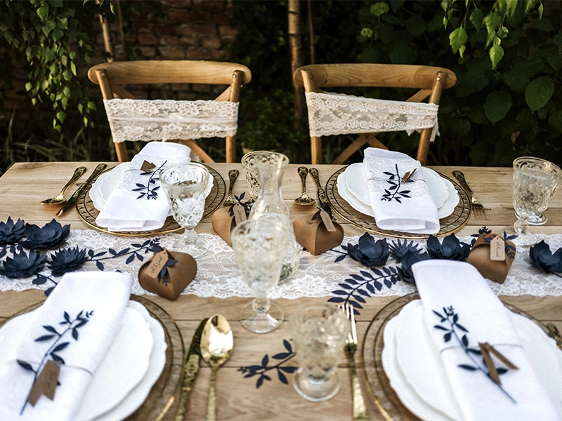 - Użyj koronki do ozdobienia stołów i krzeseł, aby dodać elegancji i spójności dekoracji.