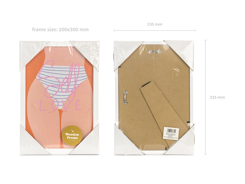 - Drewniana ramka na zdjęcie w kolorze białym z plakatem, podstawką i 2 zawieszkami, co umożliwia użycie ramki w pionie i w poziomie, wymiary ramki ok. 20 x 30 cm.