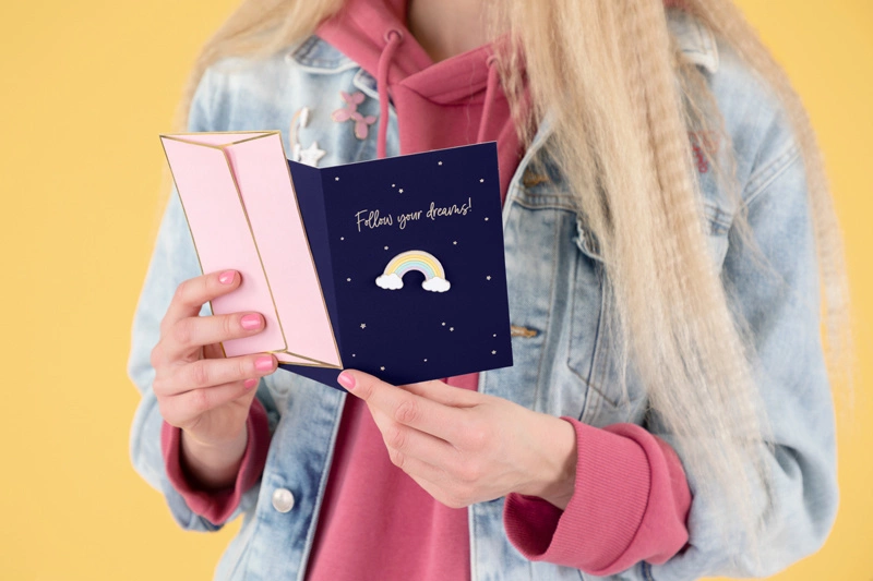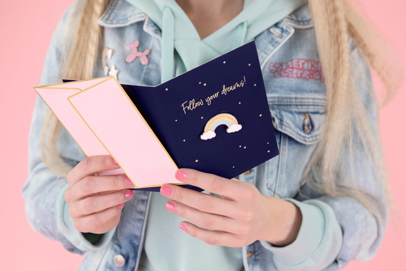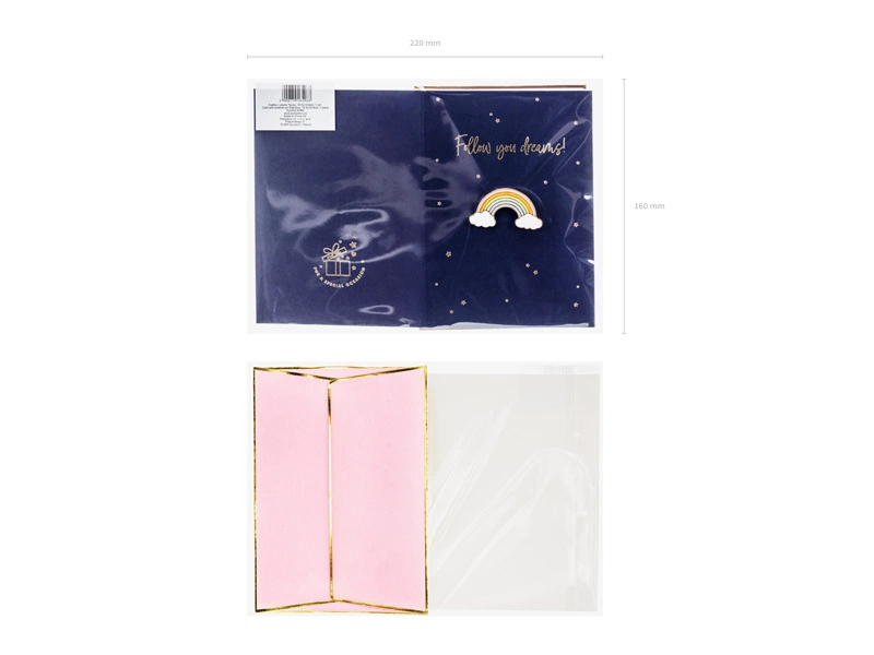 Poznaj niezwykłą kartkę okolicznościową, która z pewnością oczaruje każdego, kto ją otrzyma! Ta granatowa kartka z eleganckim złotym metalizowanym nadrukiem i pinem w kształcie tęczy to doskonały sposób na wyrażenie swoich uczuć. Różowa koperta ze złotym metalizowanym nadrukiem dodaje całości wyjątkowego charakteru i elegancji.