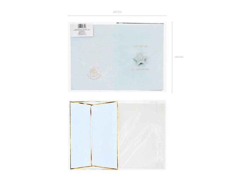 - Kartka w niebieskim kolorze ze złotym metalizowanym nadrukiem z pinem w kształcie gwiazdki z napisem Dad i niebieską kopertą ze złotym metalizowanym nadrukiem, wymiary kartki ok. 10.5 x 14.8 cm, wymiary pina ok. 3 x 3 cm.