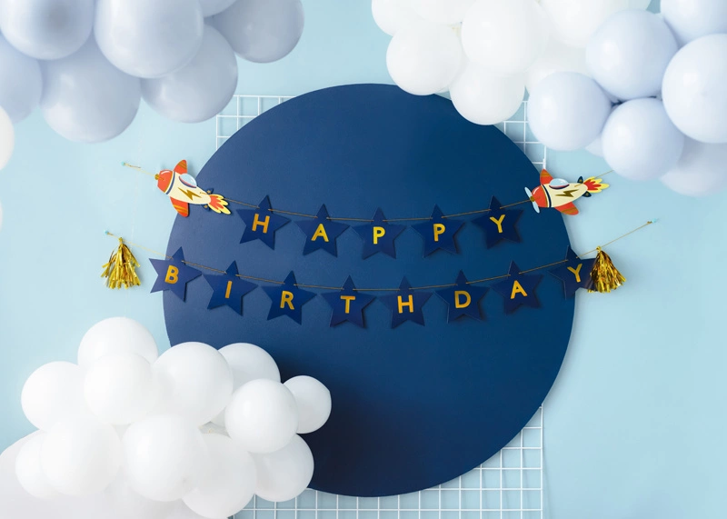 - Aby uzyskać jeszcze bardziej efektowny wygląd, połącz baner z innymi dekoracjami w podobnej kolorystyce, np. balonami w kształcie samolotów.