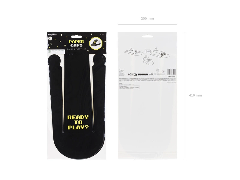 - Czapki papierowe Gamer w kolorze czarnym z nadrukiem w kolorze neonowo żółtym, wymiary ok. 38.5 x 18.5 cm. (1 op. / 6 szt.)