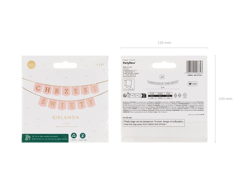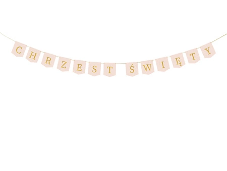 - Baner ''Chrzest Święty'' wykonany z papieru w kolorze jasnoróżowym ze złotym napisem oraz sznurek w kolorze złotym o długości ok. 2.5 m. Produkt do samodzielnego złożenia.