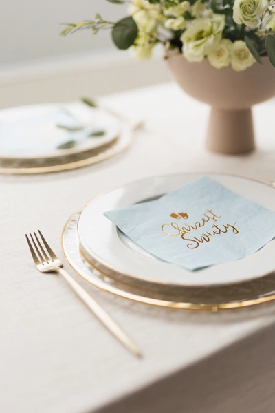 Aby uzyskać jeszcze bardziej elegancki efekt, połącz serwetki z innymi dekoracjami w kolorze złotym lub jasnoniebieskim, takimi jak świeczniki, wstążki czy balony.
