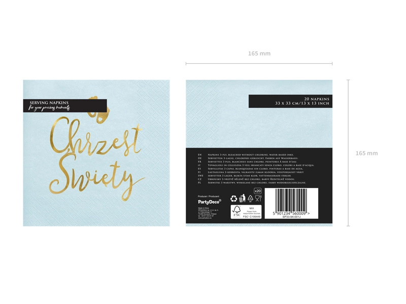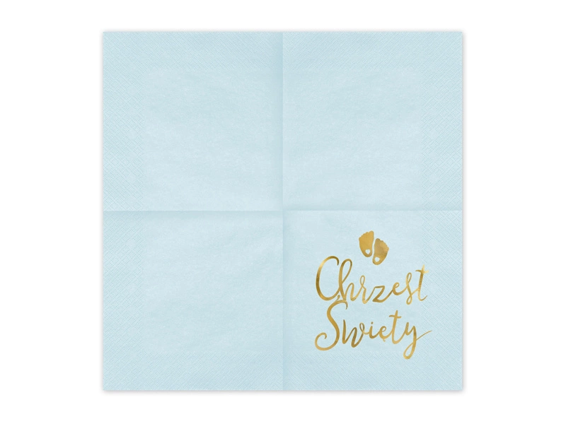 - Serwetki papierowe w kolorze jasnoniebieskim ze złotym nadrukiem i napisem "Chrzest Święty", wymiary po rozłożeniu ok. 33 x 33 cm, wymiary po złożeniu ok. 16.5 x 16.5 cm. (1 op. / 12 szt.)
