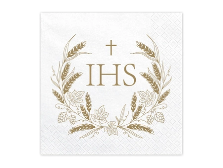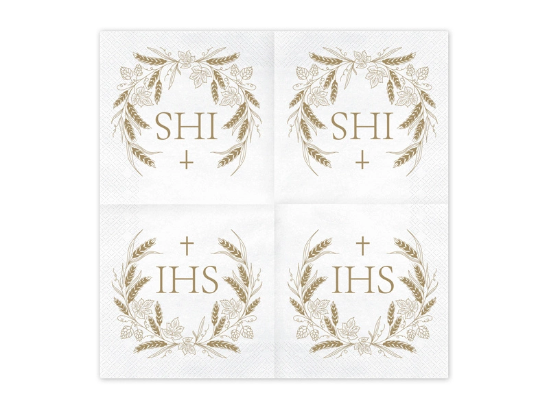 - Serwetki papierowe IHS białe ze złotym nadrukiem, wymiary po rozłożeniu ok. 33 x 33 cm, wymiary po złożeniu ok. 16.5 x 16.5 cm. (1 op. / 12 szt.)