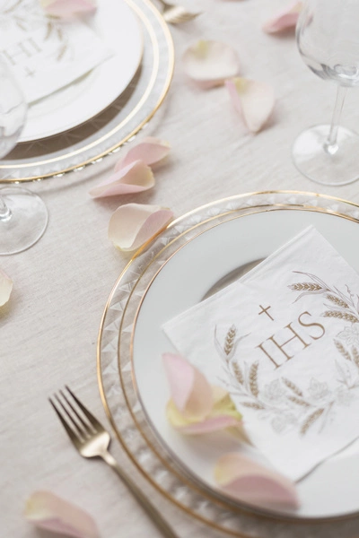 - Aby uzyskać jeszcze bardziej elegancki efekt, połącz serwetki IHS z innymi złotymi akcentami, takimi jak świeczniki czy sztućce.