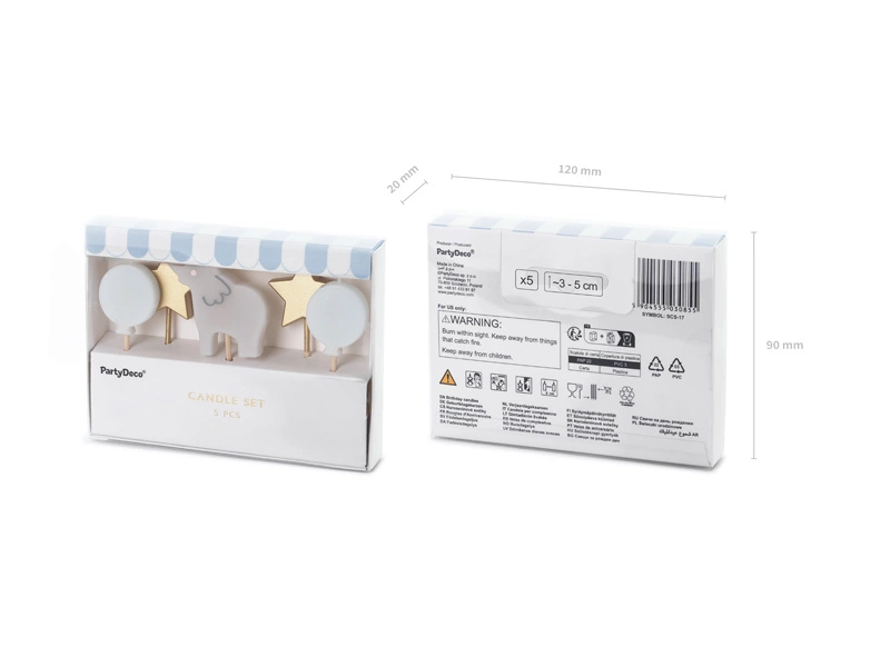 - Świeczki urodzinowe Słonik, mix kolorów i wzorów, wysokość ok. 3 - 5 cm. (1 op. / 5 szt.)
