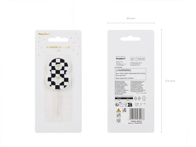 Wprowadź odrobinę magii do swojego przyjęcia urodzinowego dzięki naszej świeczce urodzinowej w kształcie cyferki 8! Ta elegancka świeczka z wzorem szachownicy o wysokości 5.5 cm z pewnością przyciągnie wzrok i doda blasku każdej uroczystości.