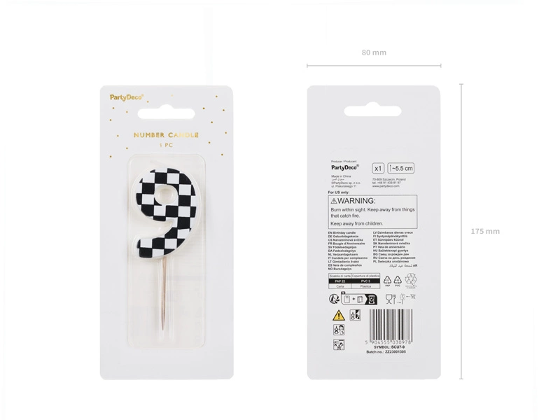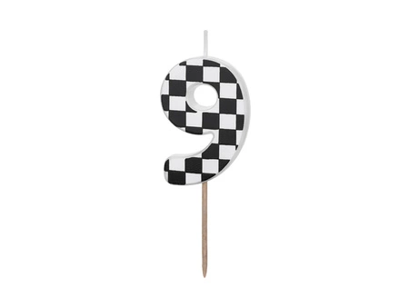 - Świeczka urodzinowa Cyferka 9 ze wzorem szachownicy, rozmiar ok. 5.5 cm.