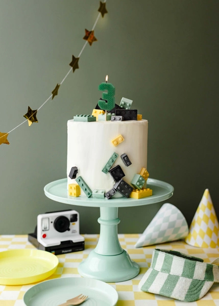 - Świeczka urodzinowa Cyferka 3 we wzór klocka w kolorze zielonym, rozmiar ok. 6 cm.