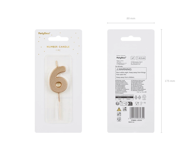 - Świeczka urodzinowa Cyferka 6 w kolorze złotym, rozmiar ok. 4.5 cm.