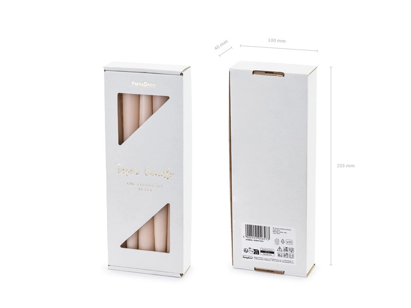 - Świeca stożkowa matowa w kolorze nude, wysokość ok. 24 cm. Czas palenia 1 sztuki ok. 5 godzin. (1 op. / 10 szt.)