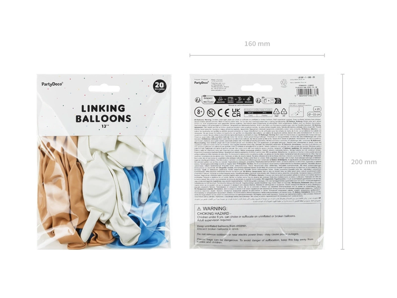 Wprowadź odrobinę magii na swoją imprezę dzięki balonom z łącznikiem w różnorodnych kolorach! Doskonałe na każdą okazję - od wesel, przez wieczory panieńskie, urodziny, Halloween, baby shower, Boże Narodzenie, aż po Walentynki. Te balony o średnicy 33 cm (13'') w zestawie 20 sztuk (6 szt. nude, 6 szt. białych i 8 szt. jasnoniebieskich) z pewnością przyciągną uwagę Twoich gości.