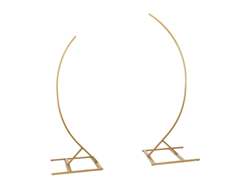 - Stojak w kształcie dwóch łuków, wykonany ze stali w kolorze złotym, wysokość łuków 200 cm i 180 cm. Produkt łatwy w montażu, po złożeniu stanowi stabilną konstrukcję. Nadaje się do wielokrotnego użycia, idealny do profesjonalnego zastosowania. Zestaw zawi