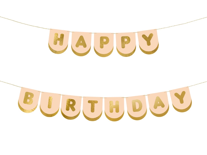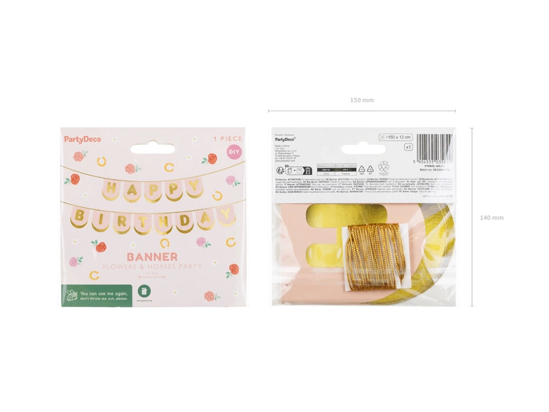 - Baner Konie w kolorze jasnoróżowym ze złotym napisem Happy Birthday, wykonany z papieru, wymiary sznurka ok. 2,5 m. wymiary po złożeniu: wysokość ok. 13 cm, długość ok. 150 cm