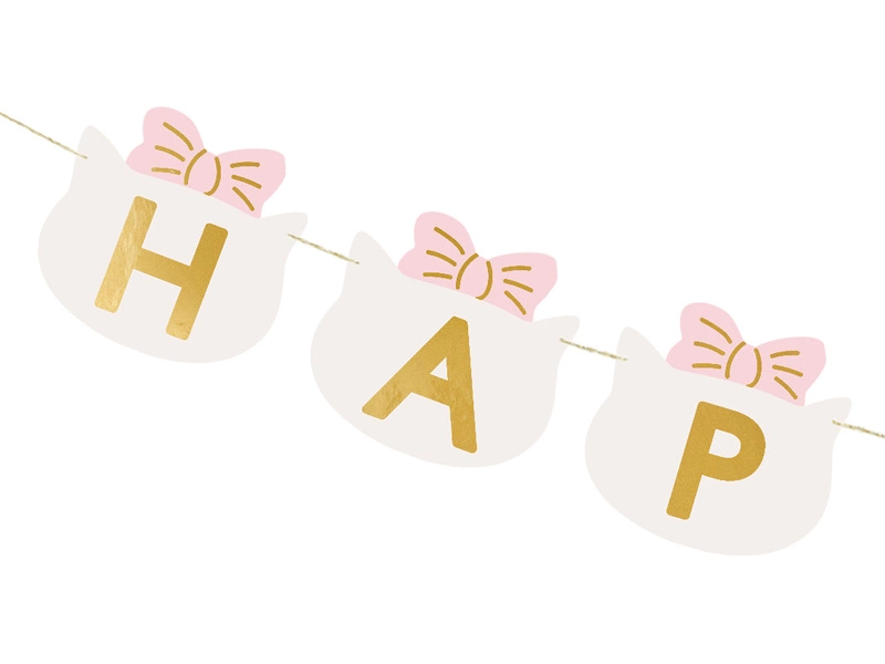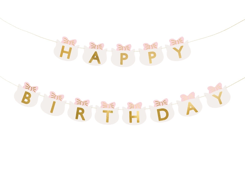 - Baner Happy Birthday – obowiązkowy element dekoracji urodzin. Każda flagietka ma kształt kotka w kokardce. W połączeniu z innymi produktami PartyDeco baner pozwoli przygotować urocze tematyczne urodziny dla dziewczynki. Baner Happy Birthday Kotki, mix ko