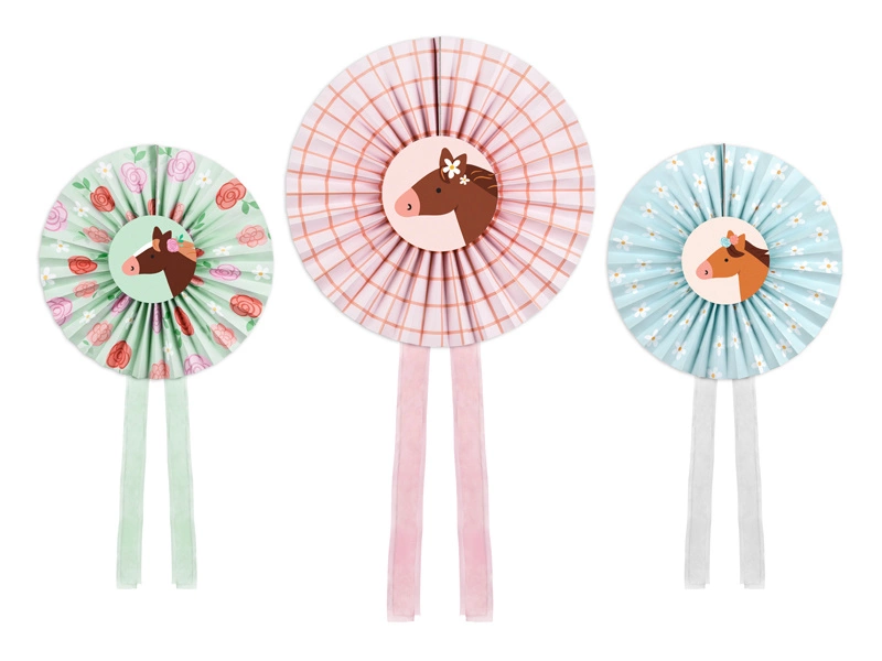 - Rozety dekoracyjne Konie wykonane z papieru, z wstążką, mix kolorów, średnice po złożeniu ok. 35 cm (1 op. / 3 szt.)