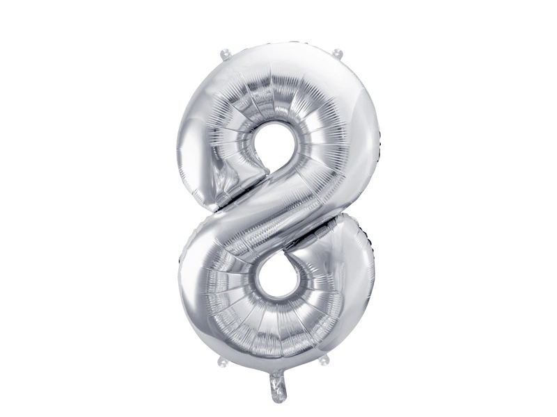 - Balon foliowy metalizowany Cyfra ''8'' w kolorze srebrnym , rozmiar przed napompowaniem ok. 86 cm (34''), rozmiar po napompowaniu ok. 72 cm (28''). Do napompowania powietrzem i helem. Zestaw zawiera słomkę.
