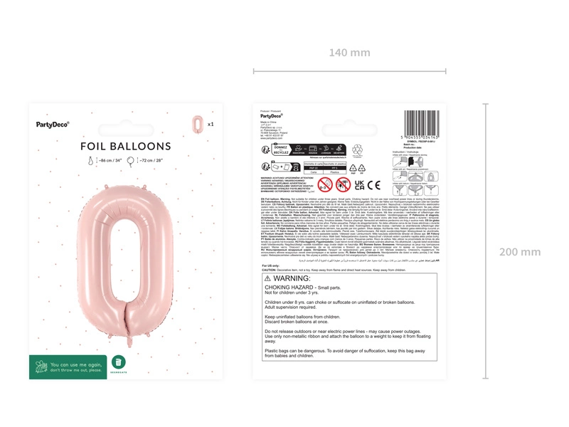 - Balon foliowy pastelowy Cyfra ''0'' w kolorze jasnoróżowym , rozmiar przed napompowaniem ok. 86 cm (34''), rozmiar po napompowaniu ok. 72 cm (28''). Do napompowania powietrzem i helem. Zestaw zawiera słomkę